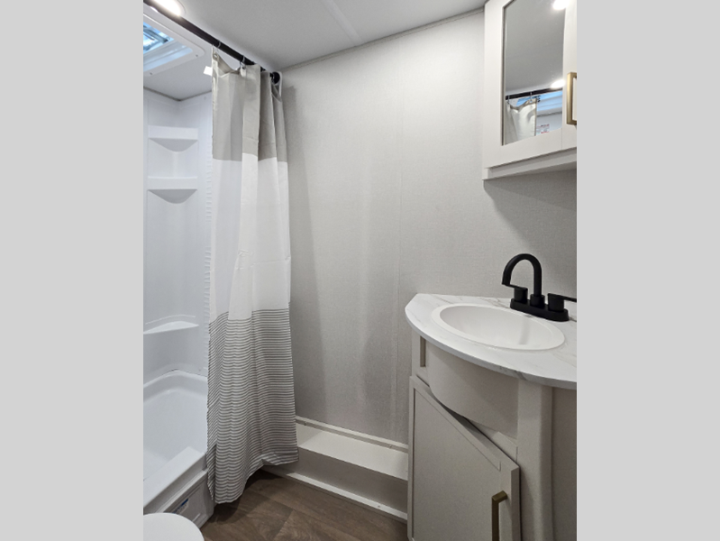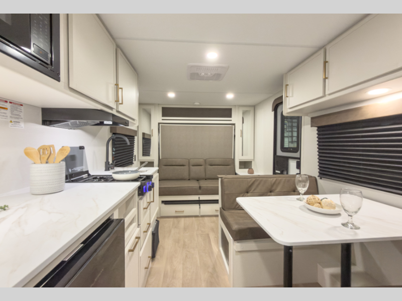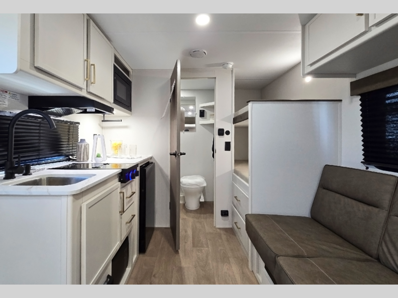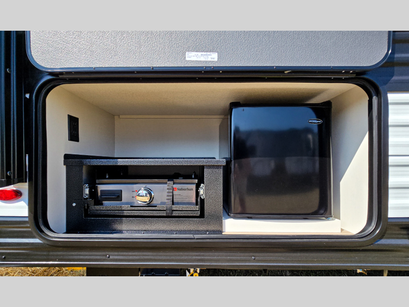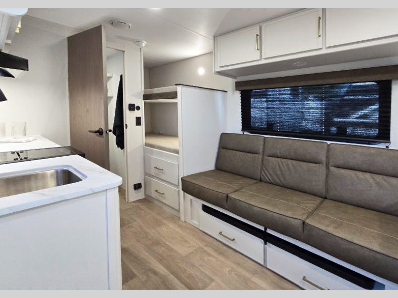 Each model is constructed to a superior standard with an insulated floor and enclosed underbelly plus residential insulated walls that will help with temperature regulation and moisture control. The 6' 6" interior height, tinted windows, and residential cabinet doors will make your space feel a little more like home, and the black automotive glass entry door is ultra sleek. You will find a power awning with a Fusion light outside, along with magnetic storage door catches, a Leash Link/bottle opener, and more convenient features!